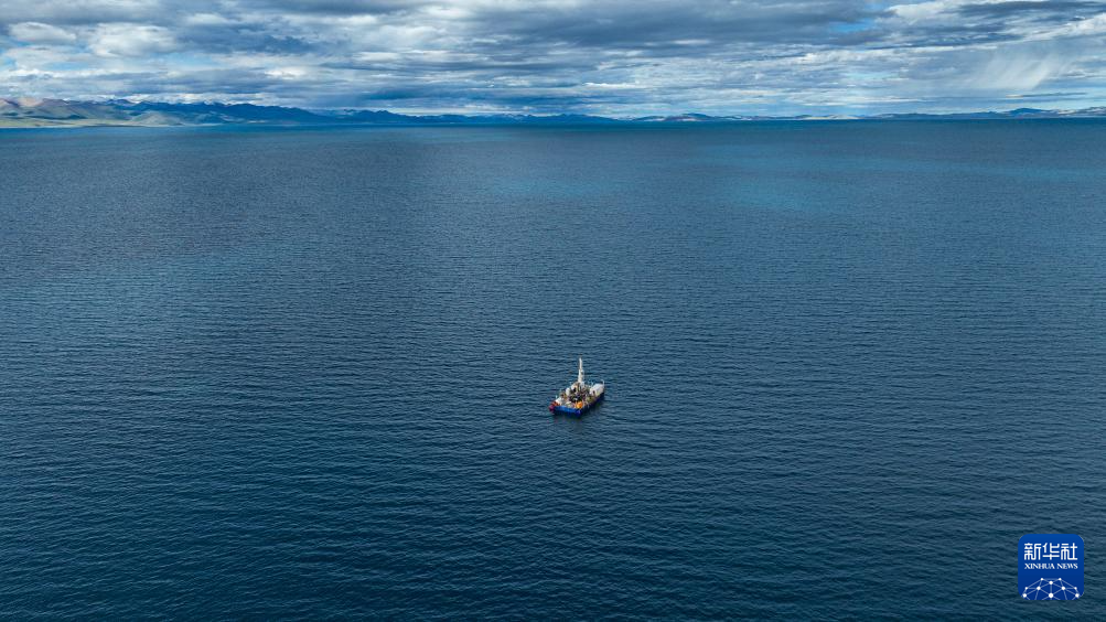 7月11日拍攝的納木錯水上鉆探平臺(無人機(jī)照片)。新華社記者 晉美多吉 攝