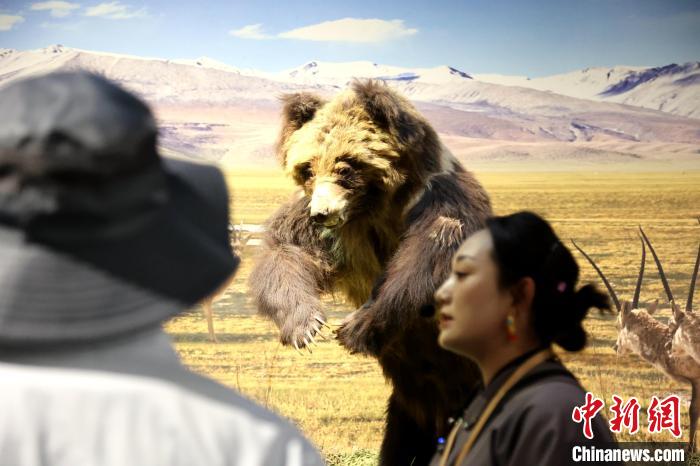 7月24日,參加“中國式現(xiàn)代化的萬千氣象·網(wǎng)絡(luò)名人青海行”活動(dòng)的網(wǎng)絡(luò)名人,抵達(dá)江河源頭青海玉樹藏族自治州,在玉樹州博物館一覽自然與人文之美。玉樹州博物館是玉樹地震災(zāi)后重建十大標(biāo)志性建筑之一,分為序廳、自然展區(qū)、人文展區(qū)、臨時(shí)展廳。其通過實(shí)物標(biāo)本等方式,展示了三江源和可可西里的野生動(dòng)物、草地、森林,以及玉樹州的歷史、建筑、服飾、飲食等。圖為工作人員介紹棕熊等野生動(dòng)物分布情況。中新社記者 張?zhí)砀?攝