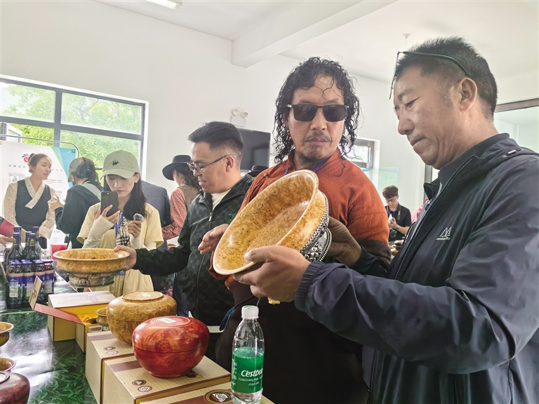 探訪團一行前往西藏山南加查達布傳統(tǒng)文化產業(yè)發(fā)展有限公司探訪加查木碗的制作技藝。在該公司的展廳內,西藏自治區(qū)級加查木碗非遺傳承人、公司負責人桑珠向探訪團詳細講解了加查木碗從選材、切割、打磨到雕刻的每一個制作環(huán)節(jié)。桑珠拿起一個個造型各異、原材料不同的木碗向探訪團介紹著木碗的品質分辨技巧、用處等。楊樹、松樹、柏樹……一塊塊承載著歲月的木頭,經過木匠們的一道道復雜的工序后,變成了精美的藝術品?!斑@種碗面像圓珠筆點涂的是上等木料制成的精品,最低售賣價值可達到4000元一個?!鄙V檎f,“現(xiàn)在來買木碗的人越來越多,很多游客也會買回去當伴手禮。這讓我更加堅定了傳承和發(fā)展這項技藝的決心。”