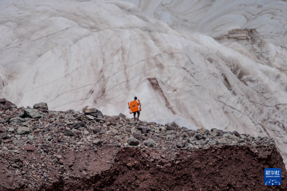 7月25日,在冬克瑪?shù)妆?,科考?duì)員在探測冰川(無人機(jī)照片)。新華社記者 伍志尊 攝