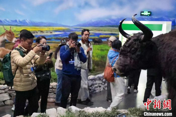 圖為此次活動(dòng)受邀嘉賓在玉樹(shù)州博物館內(nèi)拍攝牦牛標(biāo)本。薛蒂 攝