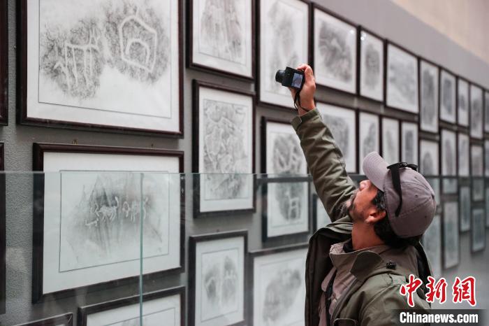 圖為受邀參加活動(dòng)的外國(guó)攝影師在玉樹(shù)州博物館內(nèi)拍攝巖畫(huà)。薛蒂 攝