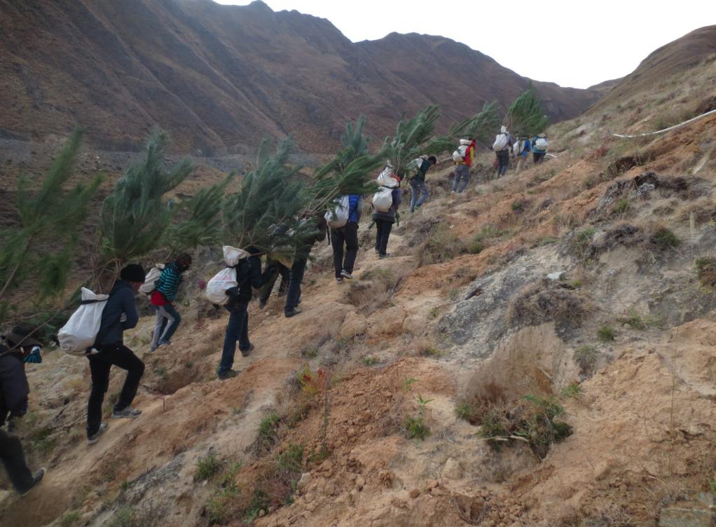 2022年3月,在拉薩南山公園西側山體造林期間,植樹人員背著土球苗上山。(受訪者供圖)