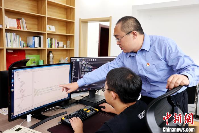 圖為蔡海寧(右)指導同事進行編程。張?zhí)砀?攝