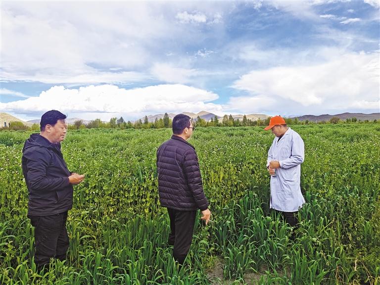 圖為浪卡子縣農(nóng)業(yè)農(nóng)村局技術(shù)人員在朗杰塘飼草基地開(kāi)展技術(shù)指導(dǎo)。記者 巴桑旺姆 攝