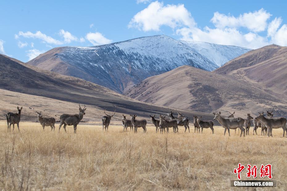 11月19日,西藏自治區(qū)昌都市類烏齊縣長毛嶺鄉(xiāng)協(xié)塘村馬鹿國家級自然保護區(qū)的草原上,西藏馬鹿在覓食、嬉戲。據(jù)悉,西藏馬鹿是馬鹿的一個亞種,屬國家二級重點保護動物。20世紀90年代初,國際瀕危動物會議認為西藏馬鹿已經(jīng)“絕種”,而西藏野生動物保護工作者在類烏齊縣考察時確定西藏馬鹿仍然存在,并于1993年設立類烏齊馬鹿自然保護區(qū),2005年升級為類烏齊馬鹿國家級自然保護區(qū)。圖為西藏馬鹿在類烏齊馬鹿國家級自然保護區(qū)內覓食。