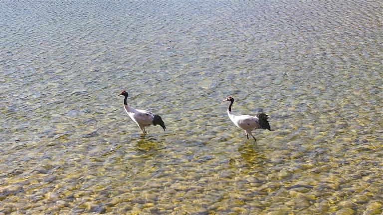 記者觀察到,黑頸鶴在龍雪河谷旁時而低頭覓食,時而閑庭信步,時而揮翅舒展,它們的身影與遠處成群結(jié)隊的牛馬、皚皚雪山以及清澈的湖水互交互織,構(gòu)成了一幅人與自然和諧共生的美好畫卷。