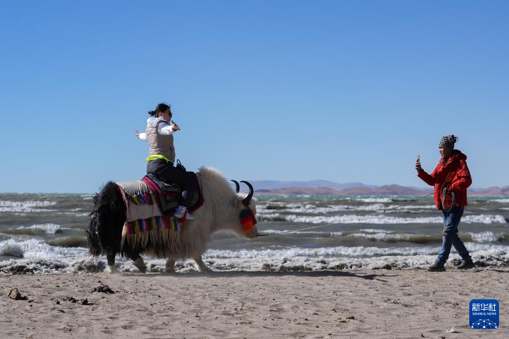 游客在納木錯湖畔拍照留念(12月11日攝)。新華社記者 丁汀 攝