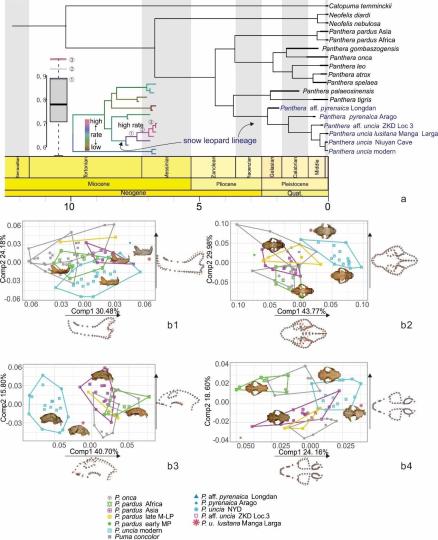 江左其杲指出,結(jié)合DNA序列和形態(tài)學(xué)數(shù)據(jù),研究團(tuán)隊(duì)推斷豹屬的系統(tǒng)發(fā)育,支持5例化石記錄的確屬于現(xiàn)生雪豹支系,且它們相對(duì)現(xiàn)生雪豹組成并系群,表明這些青藏高原之外的雪豹并非獨(dú)立于現(xiàn)生雪豹的一個(gè)分支,而是不斷從雪豹主干上分出的小分支,說明它們很有可能代表雪豹多次在特定時(shí)間段走出青藏高原的記錄,而這些記錄共同組成了雪豹演化的幾個(gè)斷面,從而得以揭秘雪豹如何一步步特化。