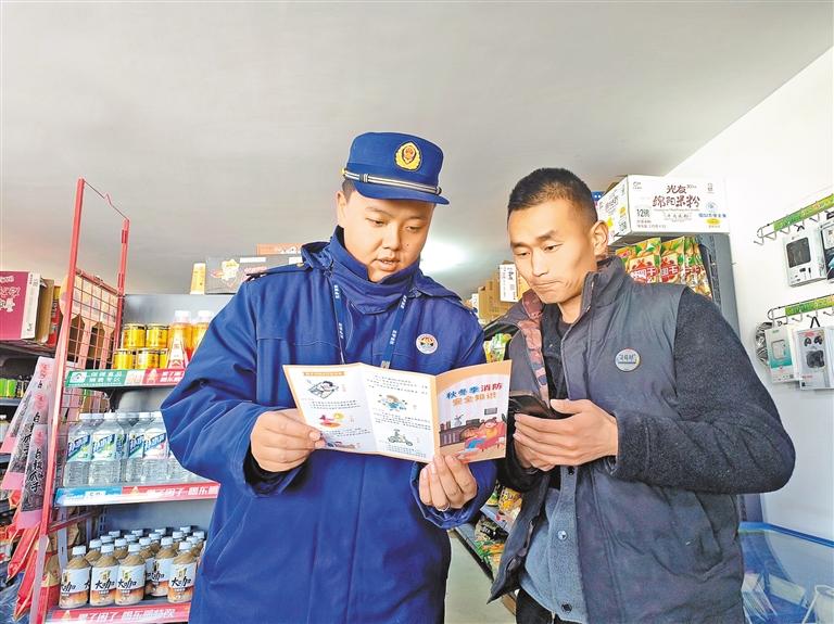 拉薩市消防救援支隊(duì)宣傳員對臨街商鋪經(jīng)營人員講解消防安全常識。