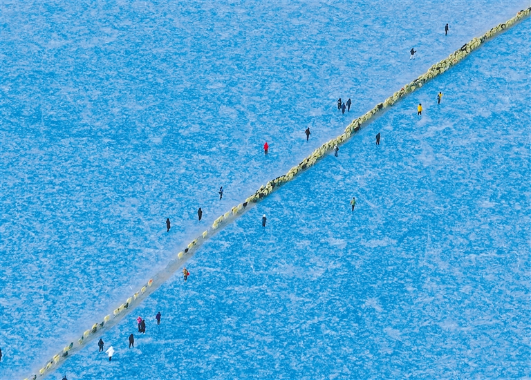 清晨,當(dāng)?shù)谝豢|陽光灑在冰面上,牧民便開始了他們的旅程。穿著傳統(tǒng)服飾的老爺爺帶頭驅(qū)趕著羊群踏上冰面。羊群沿著爐灰鋪成的小路緩緩前行,宛如一條長(zhǎng)長(zhǎng)的金色線條,在藍(lán)冰上勾勒出一幅亮麗畫卷。途中,偶爾會(huì)有小羊因冰面濕滑而摔倒,牧民總是及時(shí)將它們扶起,或背或抱地送到島上。