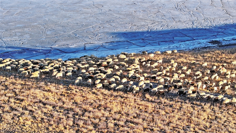 朝陽下,羊群在牧民和民警的保護(hù)下前往湖心島牧場(chǎng)。(圖片均由記者 旦增蘭澤 平措次仁 晉巴次成 武沛濤 攝)