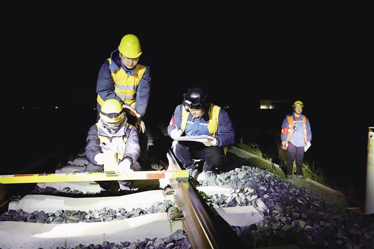 漆黑的夜晚,空曠的鐵道線上,只有測量時的對話聲和對講機里的聯(lián)控聲。4名工作人員各司其職,迎著呼嘯的冷風(fēng),借助頭燈的亮光,仔細檢查接觸網(wǎng)的各個部件,并認真測量記錄接觸網(wǎng)補償裝置等關(guān)鍵參數(shù)。