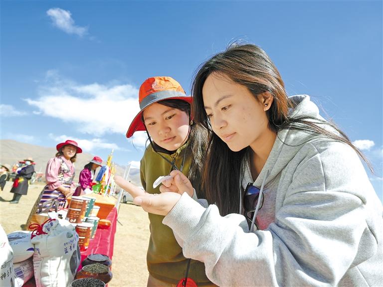 春耕儀式現(xiàn)場(chǎng),慕名前來參觀的游客正在品鑒由黑青稞磨制的糌粑。記者 孫開遠(yuǎn) 攝