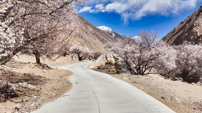 近日,西藏拉薩市尼木縣的河谷深處桃花盛開,春意盎然,處處生機(jī)勃勃。