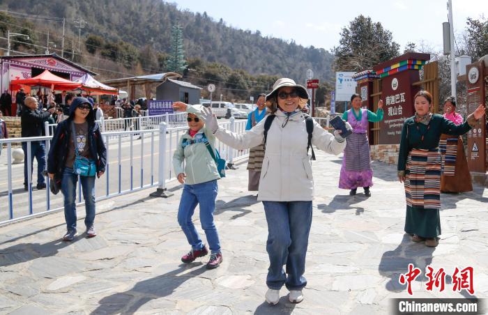 3月28日,西藏自治區(qū)林芝市,游客在雅魯藏布大峽谷旅游景區(qū)學(xué)跳藏族舞蹈。雅魯藏布大峽谷全長504.6公里,最深處6009米,被認為是世界上長度最長、深度最深的大峽谷。中新社記者 馬銘言 攝