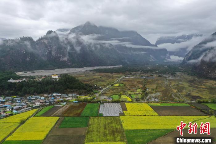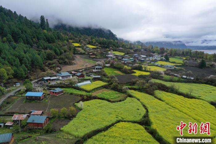 4月4日,西藏林芝市波密縣易貢鄉(xiāng)在雨后迎來絕美景致。云霧繚繞在群山之間,金黃的油菜花與森林、易貢湖、藏式民居、碧綠的青稞田相互映襯,宛如仙境。(無人機(jī)照片)中新社記者 貢嘎來松 攝