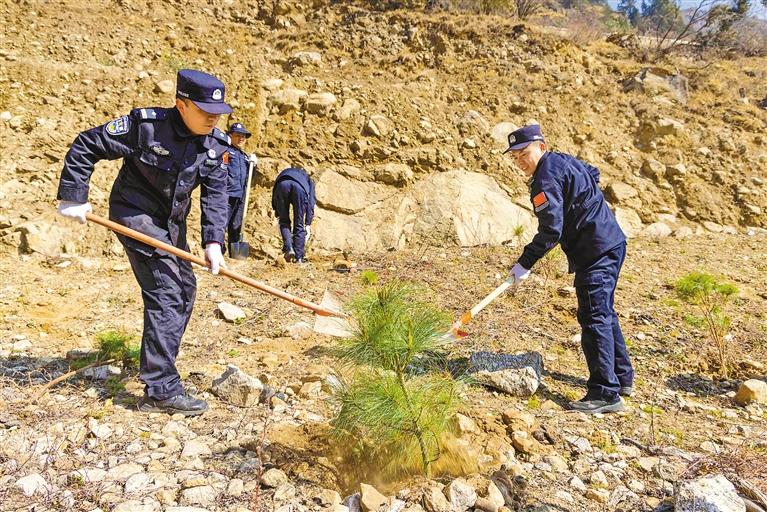 民警揮鍬鏟土栽種樹苗。