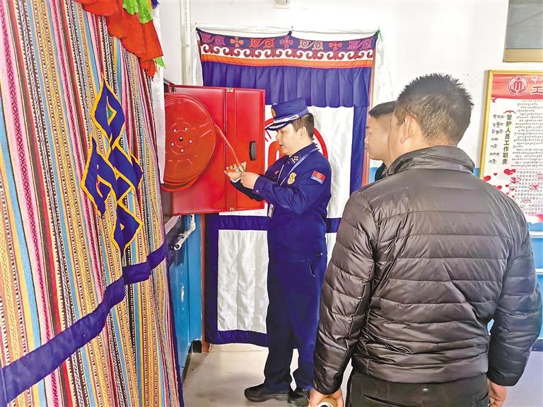 林芝市工布江達(dá)縣消防救援大隊(duì)宣傳人員檢查養(yǎng)老機(jī)構(gòu)的消防設(shè)施設(shè)備。通訊員 才旺多吉 攝