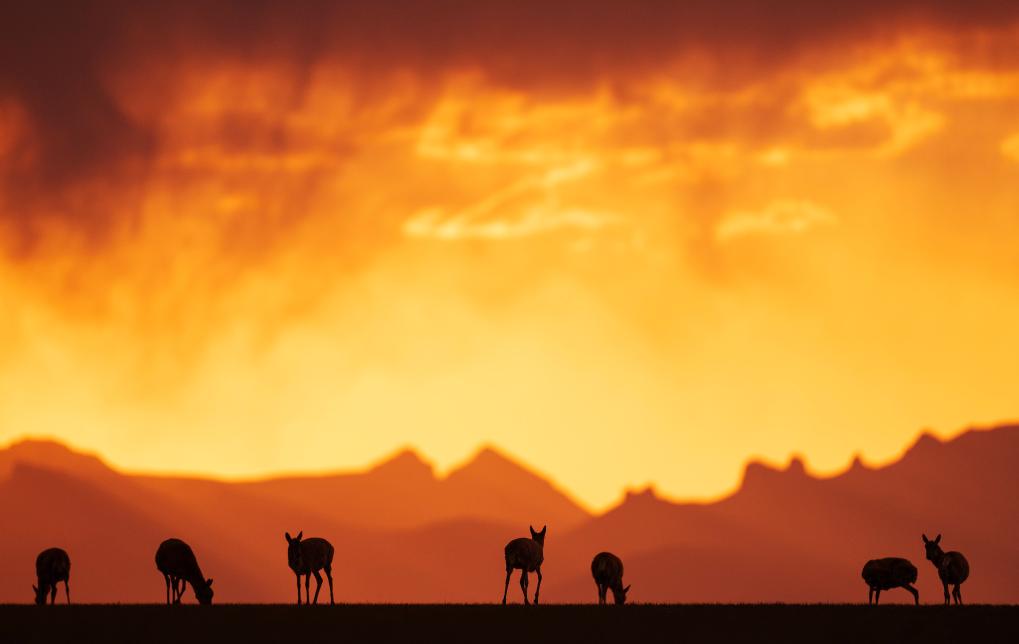 2024年6月16日,在羌塘國家級自然保護區(qū)境內(nèi)的西藏那曲市申扎縣買巴鄉(xiāng)魯確塘草原上,待產(chǎn)的藏羚羊沐浴在晚霞中。新華社記者費茂華攝