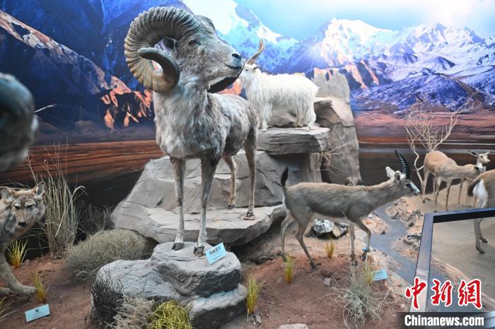 6月16日,在位于甘肅省張掖市肅南裕固族自治縣的祁連山國(guó)家公園自然博物館展陳的西藏盤羊標(biāo)本。中新社記者 李亞龍 攝