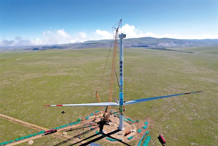 圖為西藏開投色尼區(qū)曲果嘎姆200MW風(fēng)電項(xiàng)目首臺(tái)風(fēng)電機(jī)組吊裝現(xiàn)場。周俊 記者 李梅英 攝