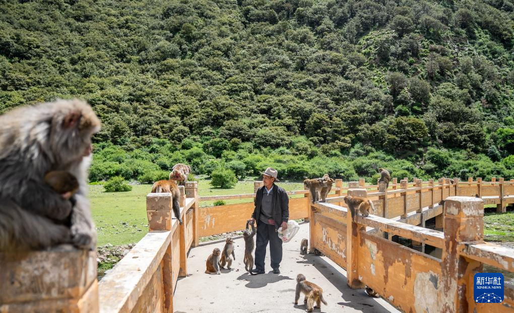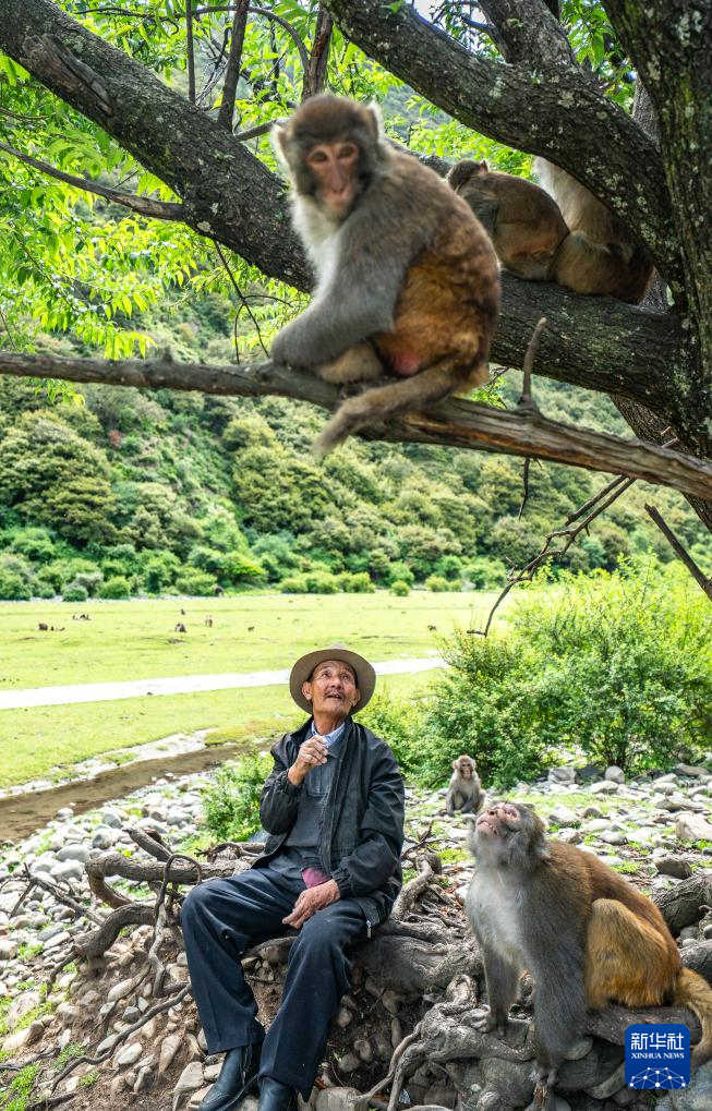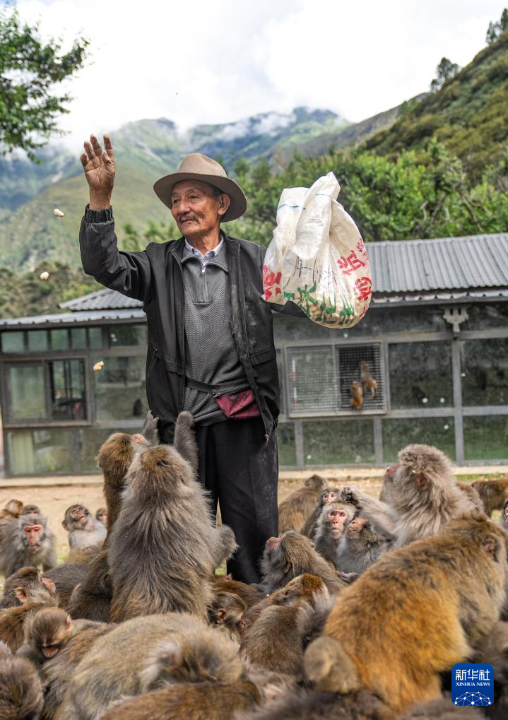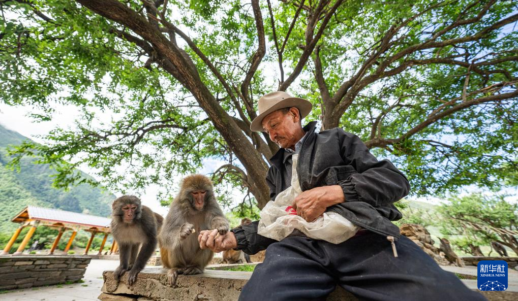 在林則生態(tài)文化旅游景區(qū),多布杰老人在給藏獼猴喂花生(7月23日攝)。新華社記者 丁增尼達 攝