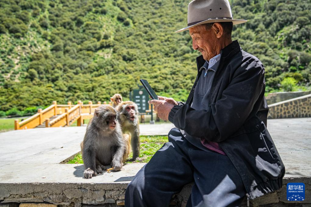 在林則生態(tài)文化旅游景區(qū),多布杰老人給藏獼猴拍照(7月23日攝)。新華社記者 丁增尼達 攝