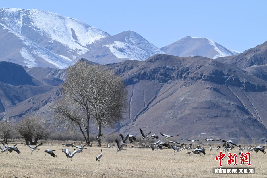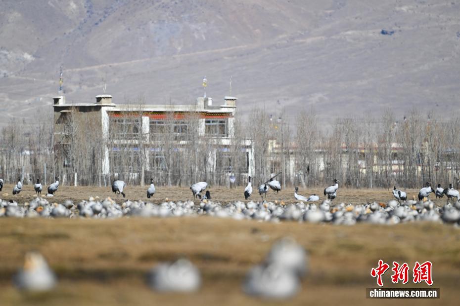 11月26日,位于西藏自治區(qū)拉薩市林周縣的黑頸鶴自然保護區(qū)內,大量越冬的黑頸鶴在卡孜水庫、農田、濕地里覓食、嬉戲。林周縣位于拉薩河上游及澎波河流域,是黑頸鶴的主要越冬地之一。中新社記者 貢嘎來松 攝