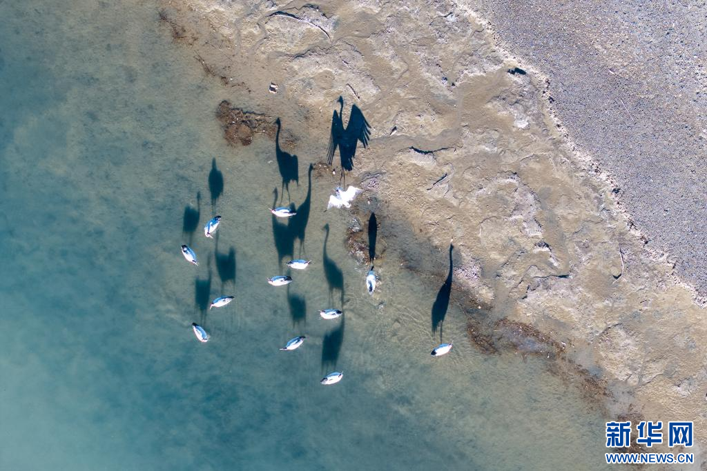 12月19日,在西藏日喀則市南木林縣的雅魯藏布江河畔拍攝的黑頸鶴(無人機(jī)照片)。新華網(wǎng) 旦增努布 攝