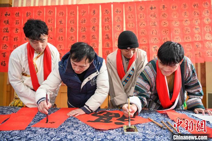 寫春聯(lián)、掛燈籠、做湯圓……在綿綿的藏歌聲中,留校西藏學(xué)生向陪伴他們連續(xù)度過(guò)了兩年春節(jié)的“代表媽媽”們敬獻(xiàn)了潔白哈達(dá),而“代表媽媽”則為她們的“西藏孩子”們圍上了紅色圍巾,互相傳遞著美好祝愿。