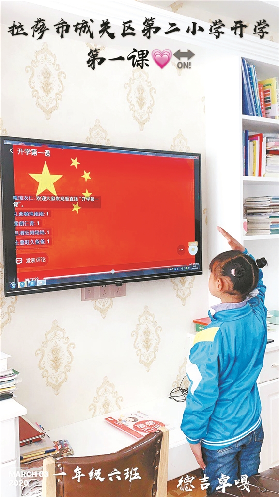 整潔的書桌上擺放著嶄新的教材,穿上干凈的校服、系好鮮艷的紅領(lǐng)巾,西藏拉薩市城關(guān)區(qū)第二小學(xué)的學(xué)生鄭重地舉起右手向電視屏幕里的國旗敬禮。隨后,教師在線上為學(xué)生進(jìn)行授課,而孩子們也在家里開啟了新的上課模式,聽課、記筆記、寫作業(yè)、背書……
