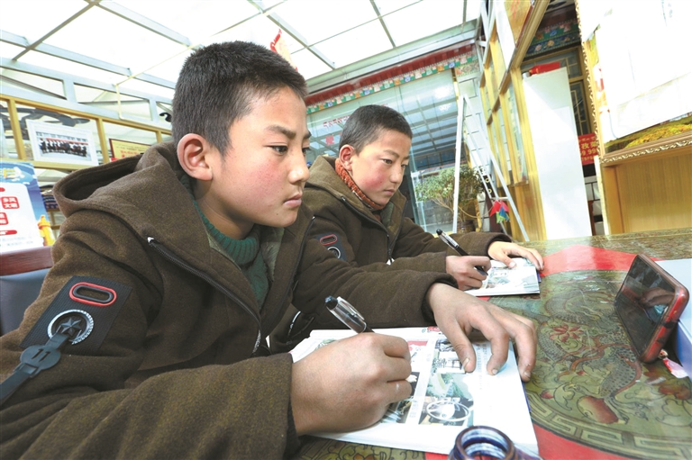 為在西藏拉薩市墨竹工卡縣甲瑪鄉(xiāng)孜孜榮村兩名中學(xué)生通過釘釘軟件上網(wǎng)課。由墨竹工卡縣委宣傳部洛克攝