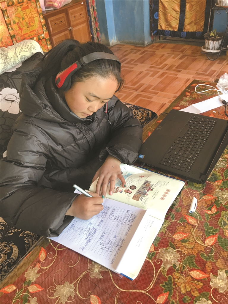 為西藏拉薩市曲水縣聶當鄉(xiāng)小學(xué)五年級二班學(xué)生旦增拉姆在家上網(wǎng)課。圖片由曲水縣委宣傳部拉姆攝