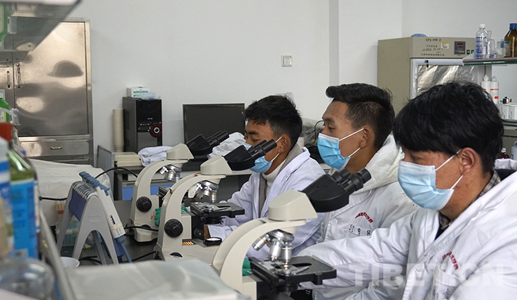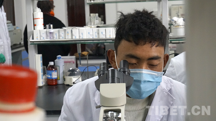 圖為4月9日返校后,次仁多吉(左一)在實(shí)驗(yàn)室做實(shí)驗(yàn) 攝影:王媛媛