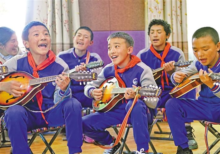 翻越重重大山,穿行茫茫草原,記者來到了四川阿壩藏族羌族自治州阿壩縣??h民族寄宿制小學(xué)內(nèi)的少年宮里,傳來一陣“嘣嘣嚓”“嘣嘣嘣嚓”的聲音。這是孩子們?cè)趶椬嘁环N叫曼陀鈴的樂器,伴隨著琴弦發(fā)出的聲音,他們合唱著一首當(dāng)?shù)孛裰{。琴聲美妙極了,很像淅淅瀝瀝的細(xì)雨聲,落在心里,特別舒服。