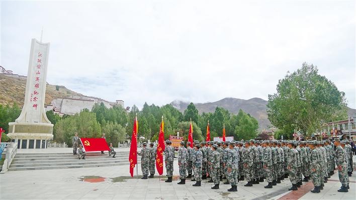 圖為駐藏某汽車(chē)團(tuán)野外駐訓(xùn)分隊(duì)在江孜宗山英雄紀(jì)念碑前開(kāi)展主題黨課活動(dòng)。加央群決 李豪 攝