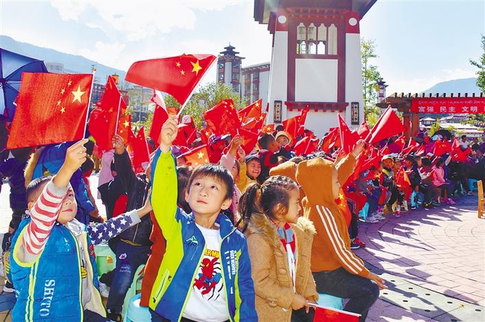 墨脫縣舉辦的文體活動(dòng)中,小朋友手持小國(guó)旗,表達(dá)愛國(guó)情。記者 孫文娟 通訊員 李龍勇 攝