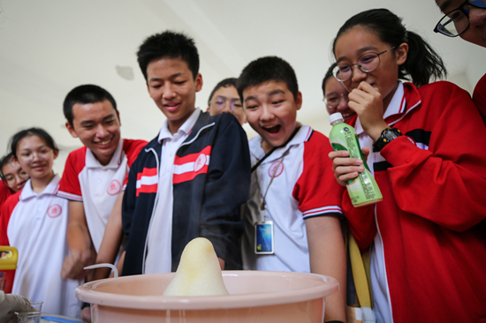 10月26日,北京師范大學(xué)??诟綄賹W(xué)校的學(xué)生參與化學(xué)趣味實(shí)驗(yàn)。當(dāng)日,北京師范大學(xué)海口附屬學(xué)校舉行第三屆科技人文節(jié)活動,在校內(nèi)營造愛科學(xué)、學(xué)科學(xué)的良好氛圍。[詳細(xì)]