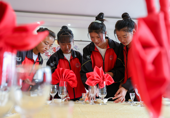 9月16日,寧夏西吉縣職業(yè)中學(xué)旅游服務(wù)與管理專業(yè)學(xué)生在學(xué)習(xí)中餐宴會(huì)擺臺(tái)實(shí)訓(xùn)課程。新華社記者 楊植森/攝