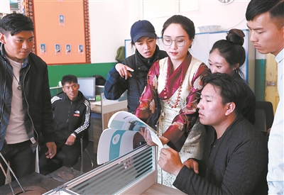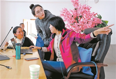 培訓(xùn)過程中,授課專家、中國(guó)教育科學(xué)研究院教師發(fā)展研究所副所長(zhǎng)卿素蘭博士(右一)由于高原反應(yīng),身體出現(xiàn)不適,桑丁卓瑪臨時(shí)客串起“助教”,幫助調(diào)試教學(xué)設(shè)備、進(jìn)行范文朗讀等。