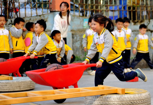 圖為幼兒園的小朋友正在進行小推車運球比賽。卓忠偉 徐穎 攝