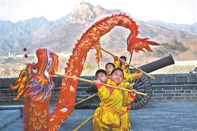 北京市密云區(qū)古北口鎮(zhèn)中心小學(xué)結(jié)合戍邊文化、地域文化,成立“舞龍”社團。喜愛傳統(tǒng)舞龍文化的學(xué)生登上長城,舞出“堅毅”精神,舞出時代風(fēng)采,舞出民族自豪。樊世剛 攝