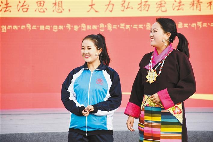 舞臺上,西藏自治區(qū)各級普法部門別出心裁地準(zhǔn)備了小品、相聲、歌曲、舞蹈等老百姓喜聞樂見的節(jié)目,為現(xiàn)場群眾送上了一臺豐盛的法治文化大餐。