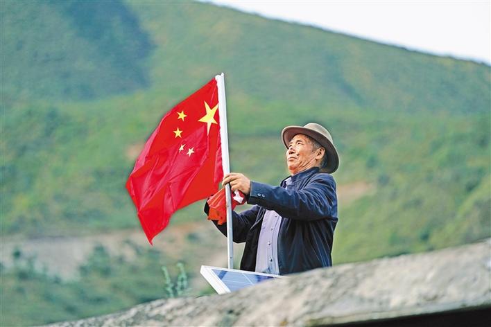 9月25日,在西藏昌都市江達(dá)縣崗?fù)写?,普巴在屋頂上換上嶄新的國旗,這是他每月進(jìn)行一次的“儀式”。今年是昌都解放70周年,普巴說,現(xiàn)在我們的美好日子,是解放軍用生命和鮮血換來的,這份恩情,我們不會(huì)忘記。新華社記者 詹彥 攝