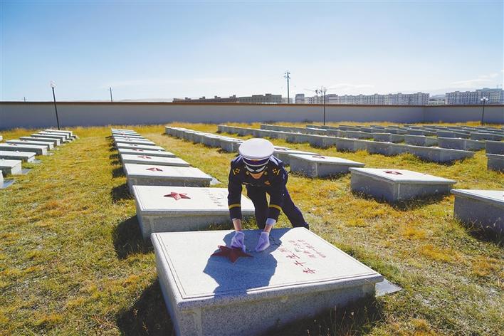 那曲市消防救援支隊(duì)隊(duì)員在擦拭革命烈士墓碑。肖暄 攝