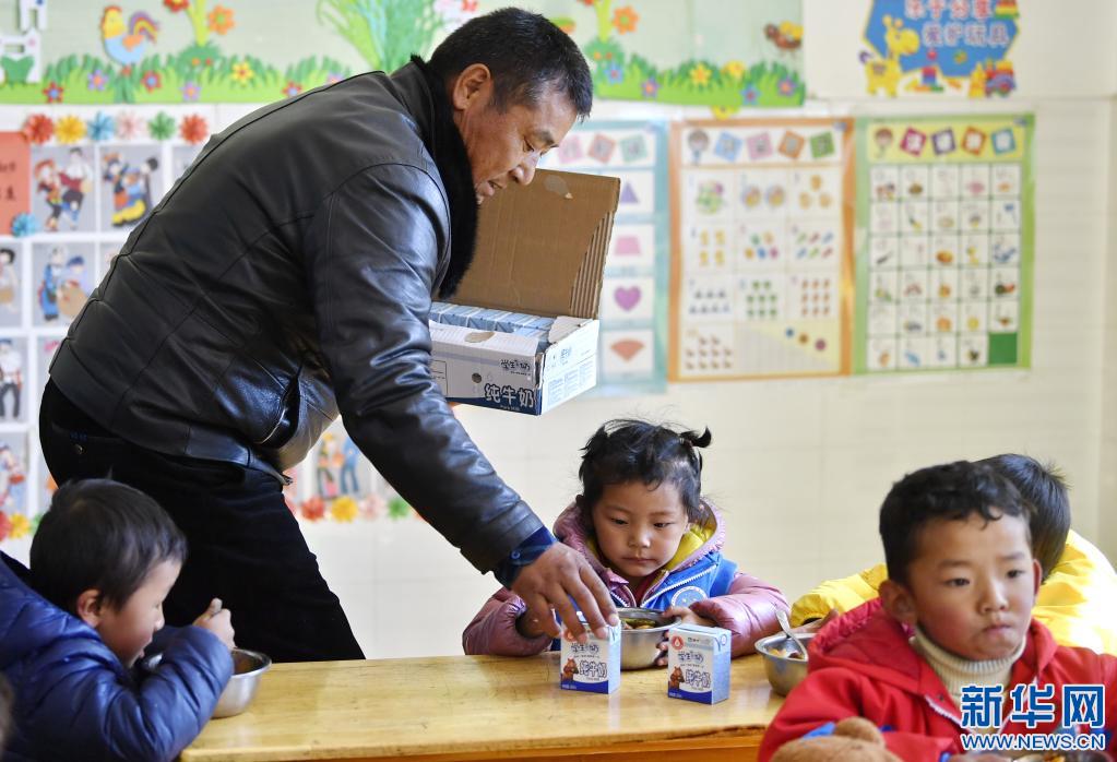 山南市貢嘎縣吉雄鎮(zhèn)紅星社區(qū)雙語幼兒園的老師正在為孩子們分發(fā)牛奶(2020年11月25日攝)。 新華社記者 張汝鋒 攝