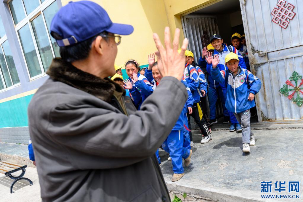 5月4日,在西藏昌都市類烏齊縣長(zhǎng)毛嶺鄉(xiāng)第一小學(xué),學(xué)生們向李純民道別。新華社記者 劉金海 攝