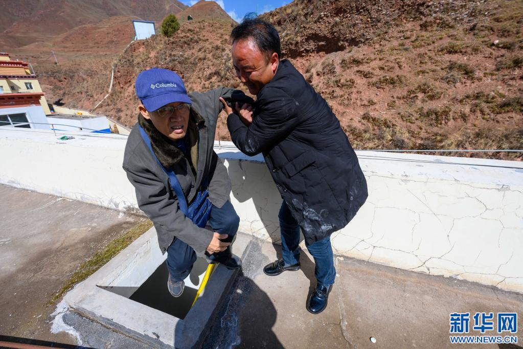 5月3日,在西藏昌都市類烏齊縣吉多鄉(xiāng)小學(xué),李純民(左)在吉多鄉(xiāng)小學(xué)校長(zhǎng)鄧增群培的幫助下,爬上學(xué)生食堂樓頂,監(jiān)督太陽能熱水器的維修工作。新華社記者 劉金海 攝