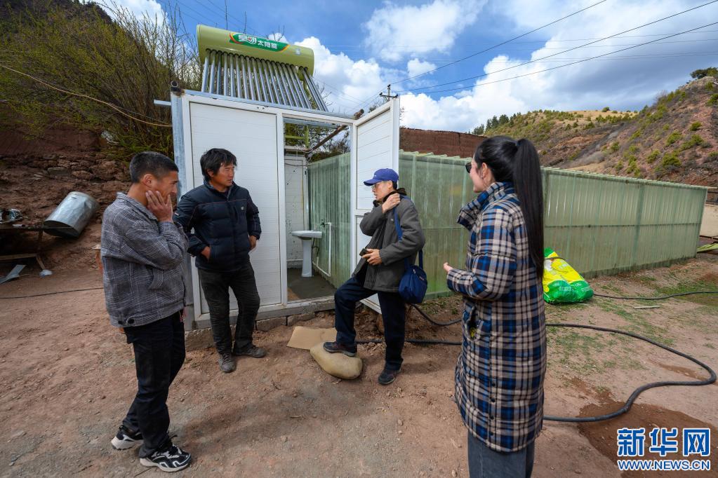 5月2日,李純民趕到西藏昌都市類烏齊縣濱達(dá)鄉(xiāng)濱達(dá)村,為當(dāng)?shù)卮迕裣虬桶偷菂f(xié)調(diào)太陽能熱水器的安裝調(diào)試工作。這是李純民(右二)通過濱達(dá)鄉(xiāng)小學(xué)老師索朗卓瑪(右一)作藏語翻譯,就熱水淋浴室與水沖廁整體改造計(jì)劃給向巴巴登(左二)提出建議。新華社記者 劉金海 攝